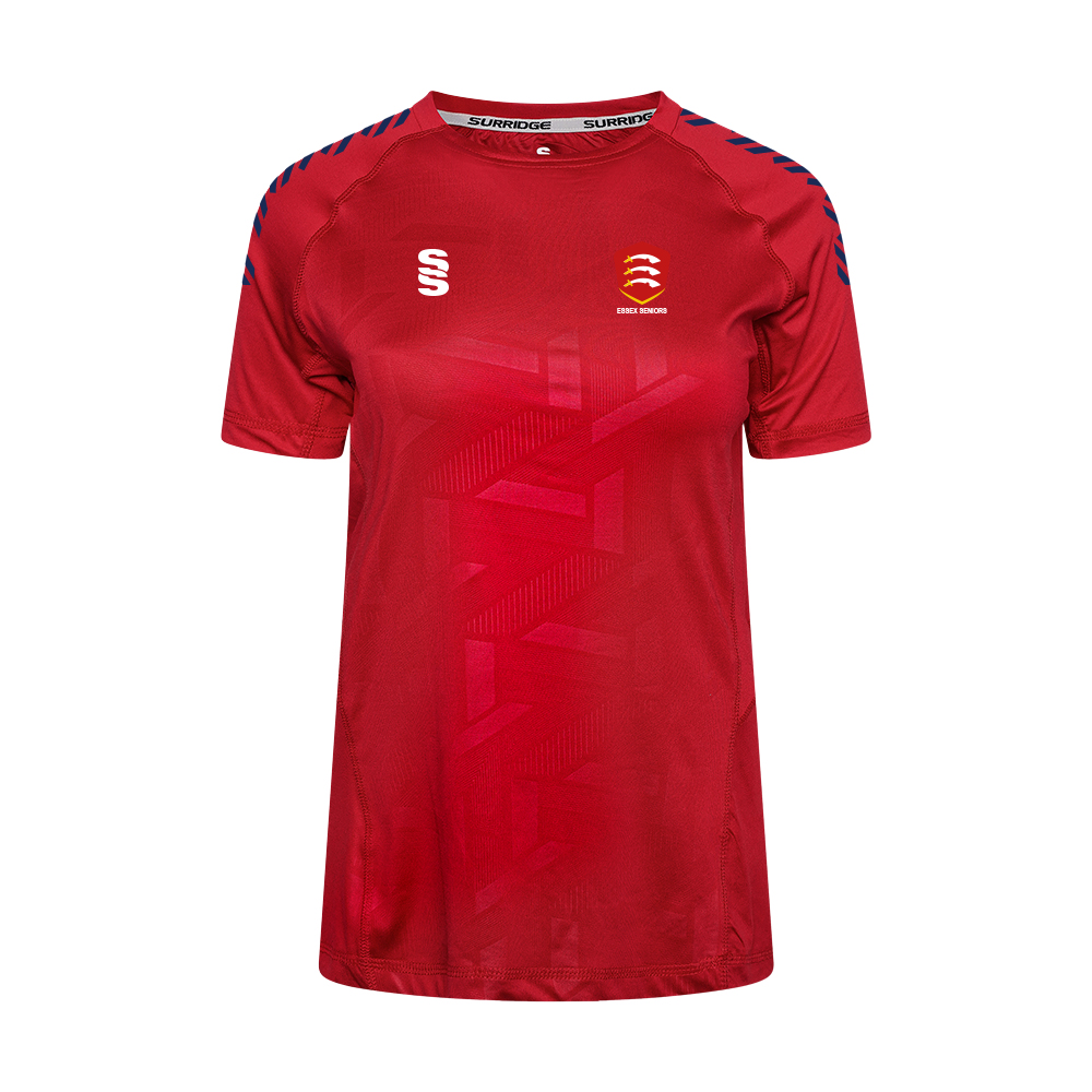 Crew neck fitted polyester interlock material with highly modern print to the from panel